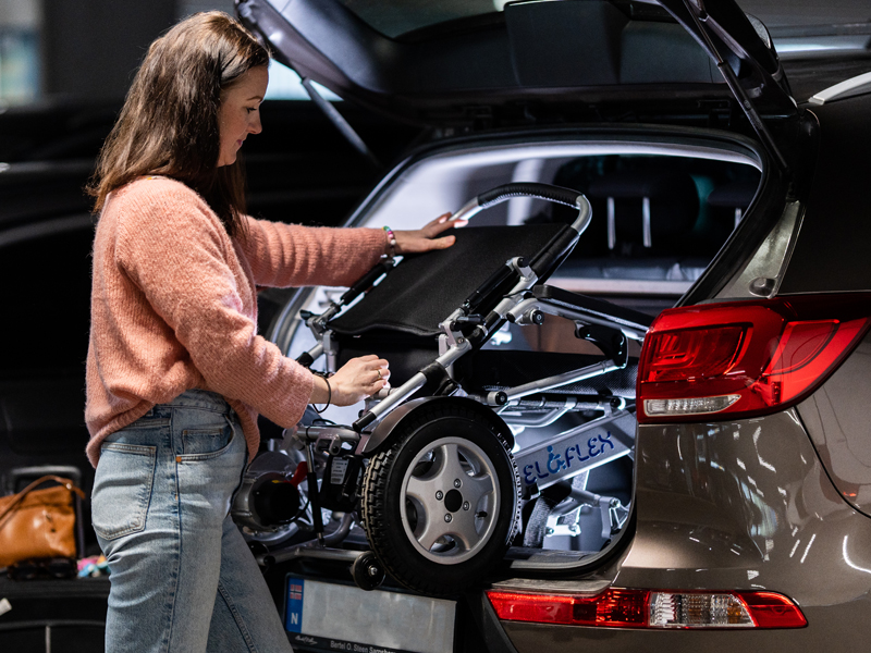Az Eloflex minden típusú autóba befér. Végre anélkül utazhat egy barátjával, egy átlagos méretű taxiban vagy egy bérelt autóban, hogy aggódnia kellene a motoros kerekesszékével kapcsolatos nehézségek miatt. Az alacsony súlynak köszönhetően egyszerűen behelyezheti a széket a saját autójába.